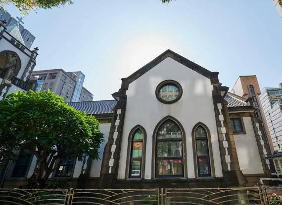 仿英國哥德與鄉村哥德風格,建築呈對稱十字型,銀白鐘樓醒目,尖拱門窗、扶壁柱、彩繪玻璃極具特色。屋內懸挑式椽尾屋架寬敞壯觀,為臺灣少見教堂建築。
